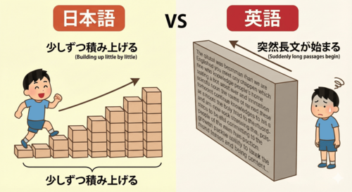 日本語は「少しずつ積み上げる」英語は「突然長文が始まる」